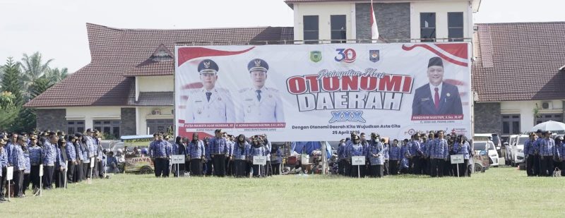 PADANG LAWAS – Bupati Padang Lawas Putra Mahkota Alam Hasibuan SE (PMA) sebagai inspektur upacara Peringatan Hari Otonomi Daerah ke XXX Tahun 2026 di halaman Kantor Bupati Padang Lawas, Senin (27/04/26).