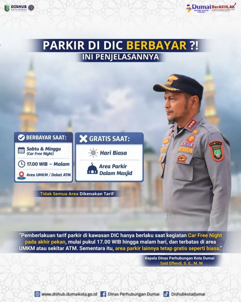 DUMAI – Pemerintah Kota Dumai melalui Dinas Perhubungan memberikan penjelasan terkait pemberlakuan tarif parkir di kawasan Dumai Islamic Centre