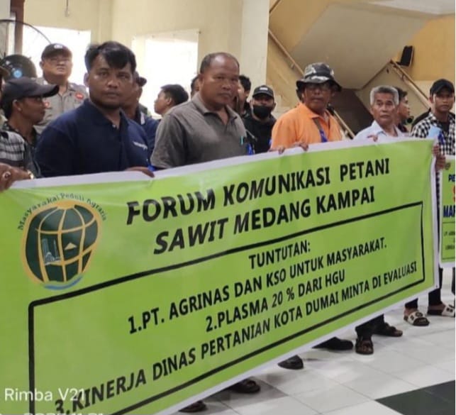 Beberapa bulan yang lalu di bulan Desembar 2025 kelompok tani masyarakat medang kampai ini telah melakukan demonstrasi damai di kantor walikota dumai dan kantor DPRD. menuntut pemerintah kota Dumai banyaknya ketidak jelasan PT Agrinas Palma dalam sistem proses KSO, plasma dan TJSL, karena kelompok tani ini Tahu betul apa yang terjadi di medang kampai dan tempat lain di kota dumai, warga kelompok tani tersebut menuntut ke pemerintah kota Dumai,supaya hak hak warga masyarakat seperti plasma sesui UU Nomor 39 Tahun 2014 tentang Perkebunan, pasal 58 Ayat 1 mewajibkan perusahaan perkebunan yang memiliki usaha izin perkebunan untuk memberikan atau memfasilitasi hak warga 20 persen.