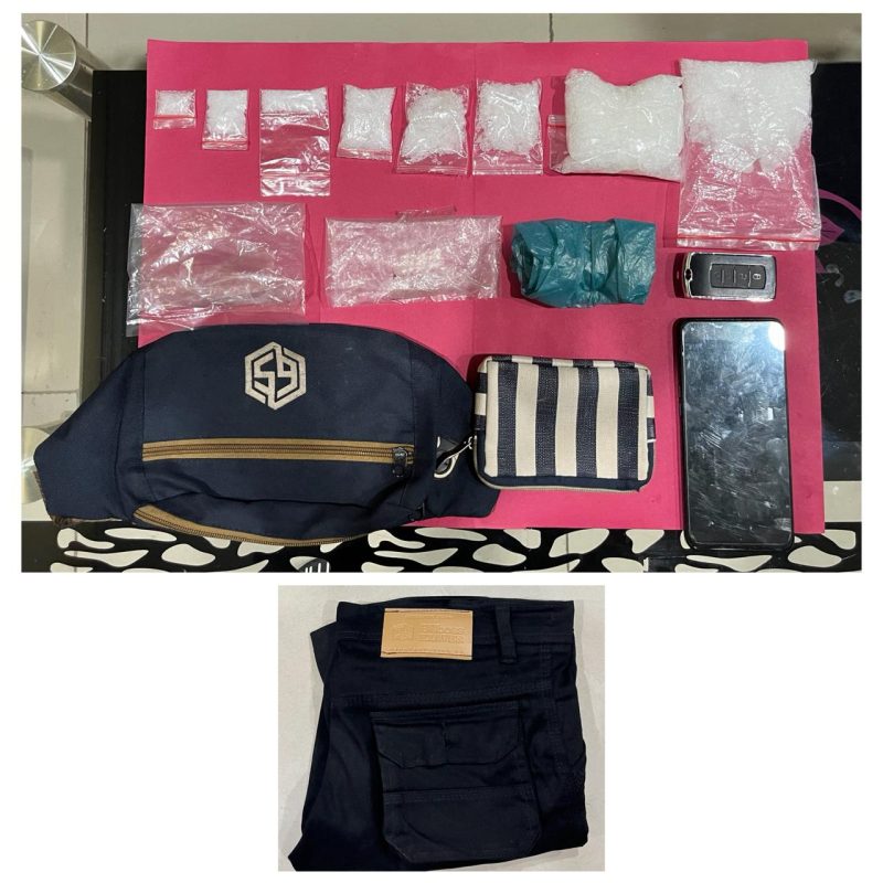 Selain itu petugas turut menyita satu tas selempang biru dongker, dua helai plastik bening, satu kantong plastik biru, satu dompet motif garis putih-biru, satu unit timbangan digital, satu unit handphone Oppo hitam, satu helai celana pendek hitam, dan satu unit sepeda motor Honda Beat Street hitam.