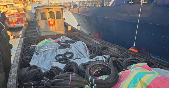Dalam pantauan, tampak aktivitas pembongkaran muatan ban bekas dari kapal ke truk pengangkut di lokasi.