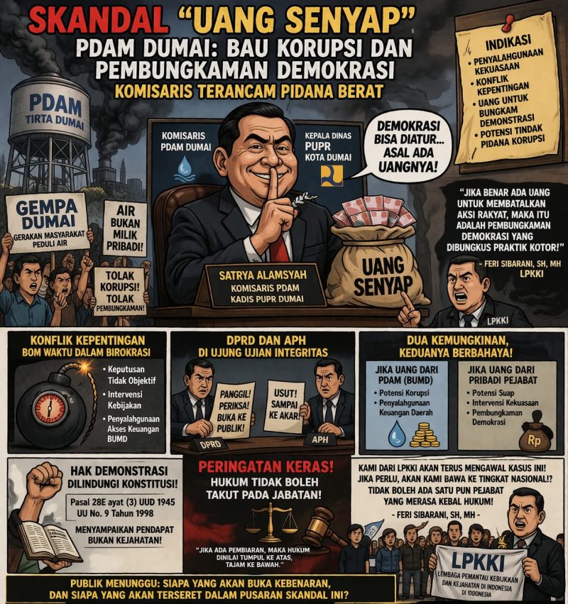 DUMAI – Dugaan praktik “uang senyap” untuk membungkam aksi demonstrasi oleh oknum pejabat di tubuh Perumdam Tirta Dumai kini memasuki fase yang lebih serius. Indikasinya diduga kuat ada penyalahgunaan kekuasaan, konflik kepentingan, dan potensi tindak pidana korupsi. 12/04/2026.