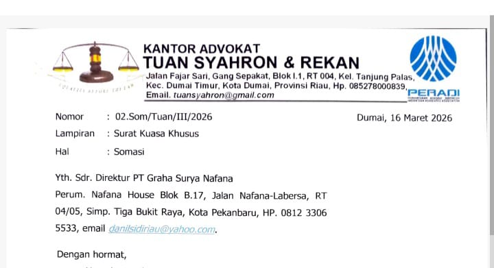 Hari ini selasa/31/03/26, kami melayangkan surat Somasi ke dua dan terakhir ke pihak developer Villa D’Anfary Regency di Pekanbaru atau ke manejemen perusahaan perumahan tersebut.dan kami dari pihak LRMRB kota Dumai tetap fokus mendampingi secara advokasi konsumen yang telah di rugikan oleh pihak developer.